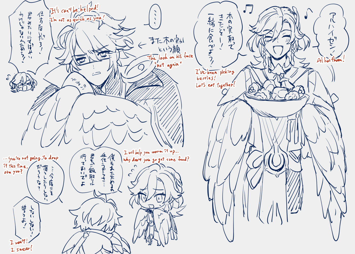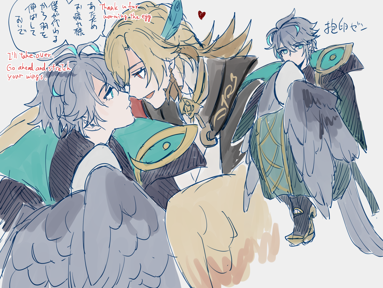無配で久しぶりに描いたら熱がぶり返したので描き殴ってました。一枚目にある通りゼンはハヤブサなので肉食で、反対にカーヴェはスズメ目なので木の実や穀物が大好きな設定です。とは言っても人間と同様に雑食な不死があるのでカーヴェも肉が食べられないというわけではなくて、好みの傾向があるという感じ。