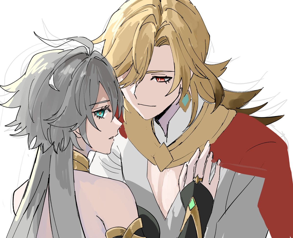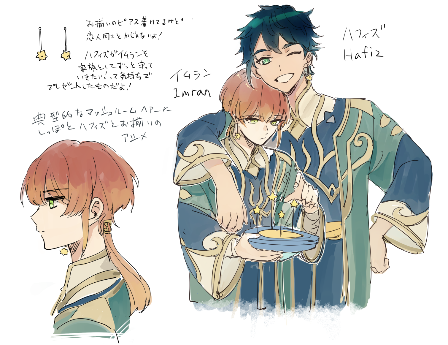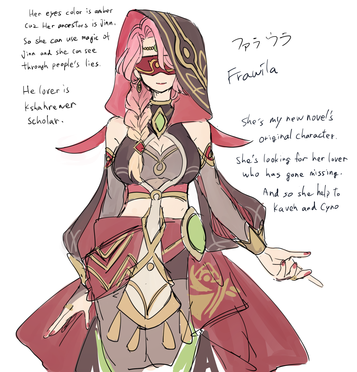 黒髪ミディアムでストレート。やや褐色な肌に深緑色の瞳で身長はカーヴェ程。